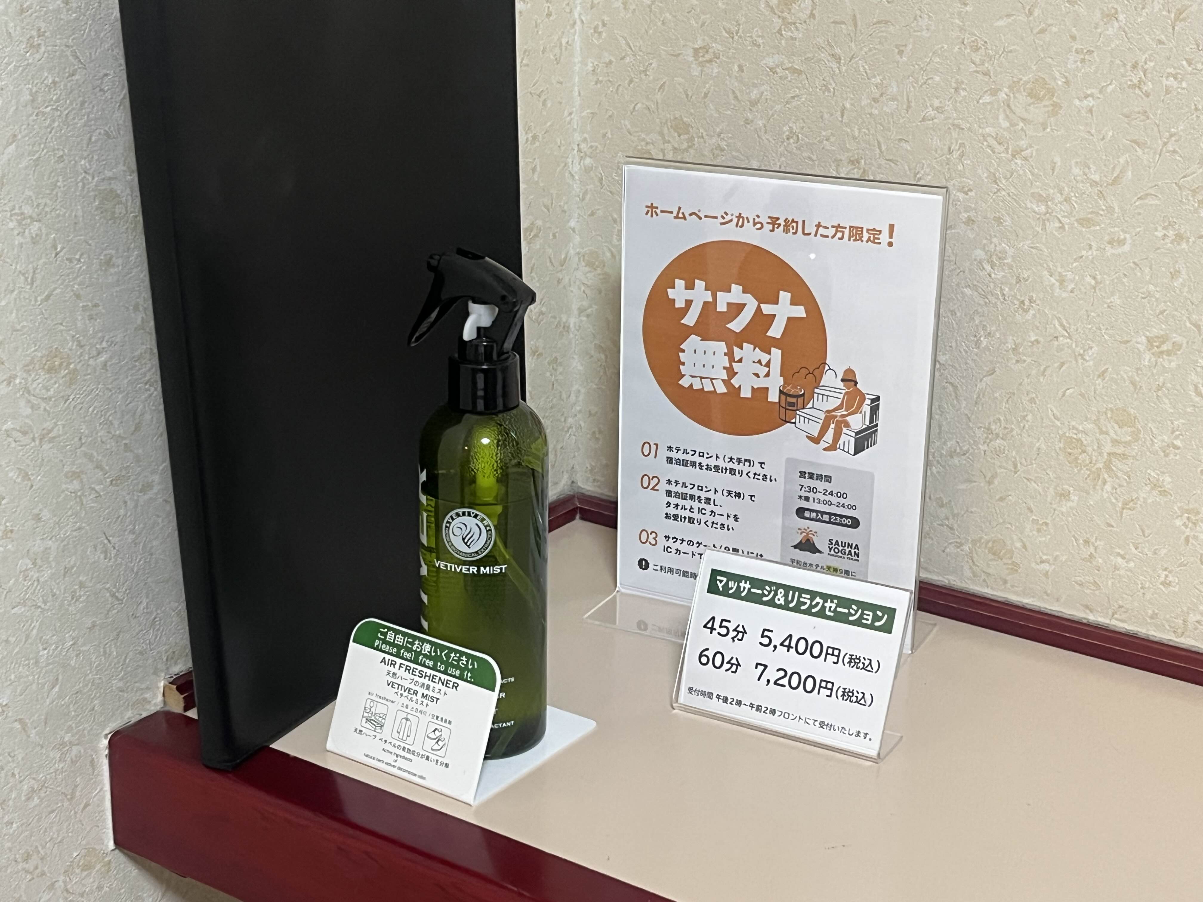 그리고 방 안에 사우나 무료 라고 적힌 안내판이 있었다. (앞에 있는 미스트는 탈취제)