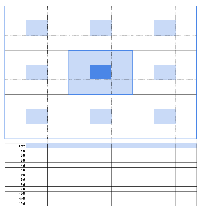 내 2026년 만다르트 계획표는 <건강, 경제, 관계, 공부, 정신, 환경, 행운, 취미>를 세부목표로 짜보았다.